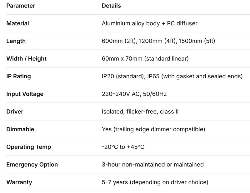 Lassen wir den Marketing-Flaum beiseite. Wenn ich mit einem Facility Manager oder einem Elektriker des Projekts spreche, sind das die Spezifikationen, nach denen er zuerst fragt. Ich habe eine kurze Liste der Kernfunktionen zusammengestellt, gefolgt von einer detaillierten Tabelle für die Nerds (ich meine das als Kompliment).